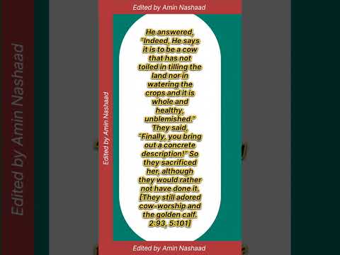 او پاسخ داد: «در واقع، او میگوید گاوی باشد که نه زحمت شخم زدن زمین را کشیده باشد و نه به محصولات آب داده باشد و سالم و بیعیب باشد.» آنها گفتند: «بالاخره، یک توصیف مشخص ارائه دادی!» بنابراین آنها او را قربانی کردند، اگرچه ترجیح میدادند این کار را نکنند. [آنها هنوز هم گاوپرستی و گوساله طلایی را دوست داشتند. 2:93، 5:101]